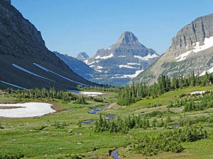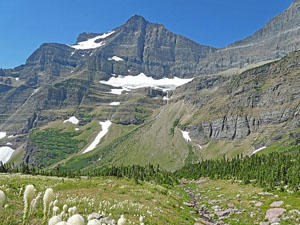 From the divide the trail descends steep switchbacks down talus slopes along the east side of the valley. As you descend enjoy ever improving views of the Sexton Glacier and Going-to-the-Sun Mountain. Matahpi Peak looms overhead. It is not unusual to run into lingering snowfields along this section of the trail.