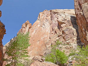 At 2.9 miles reach a signed junction at the confluence with Spring Canyon. To the left is Upper Spring Canyon. We turn right (east/southeast) into Lower Spring Canyon, a beautiful canyon with multi-hued Wingate sandstone walls towering overhead. At this point it is now 6.8 miles to the Fremont River crossing and Highway 24 at the end of the canyon.